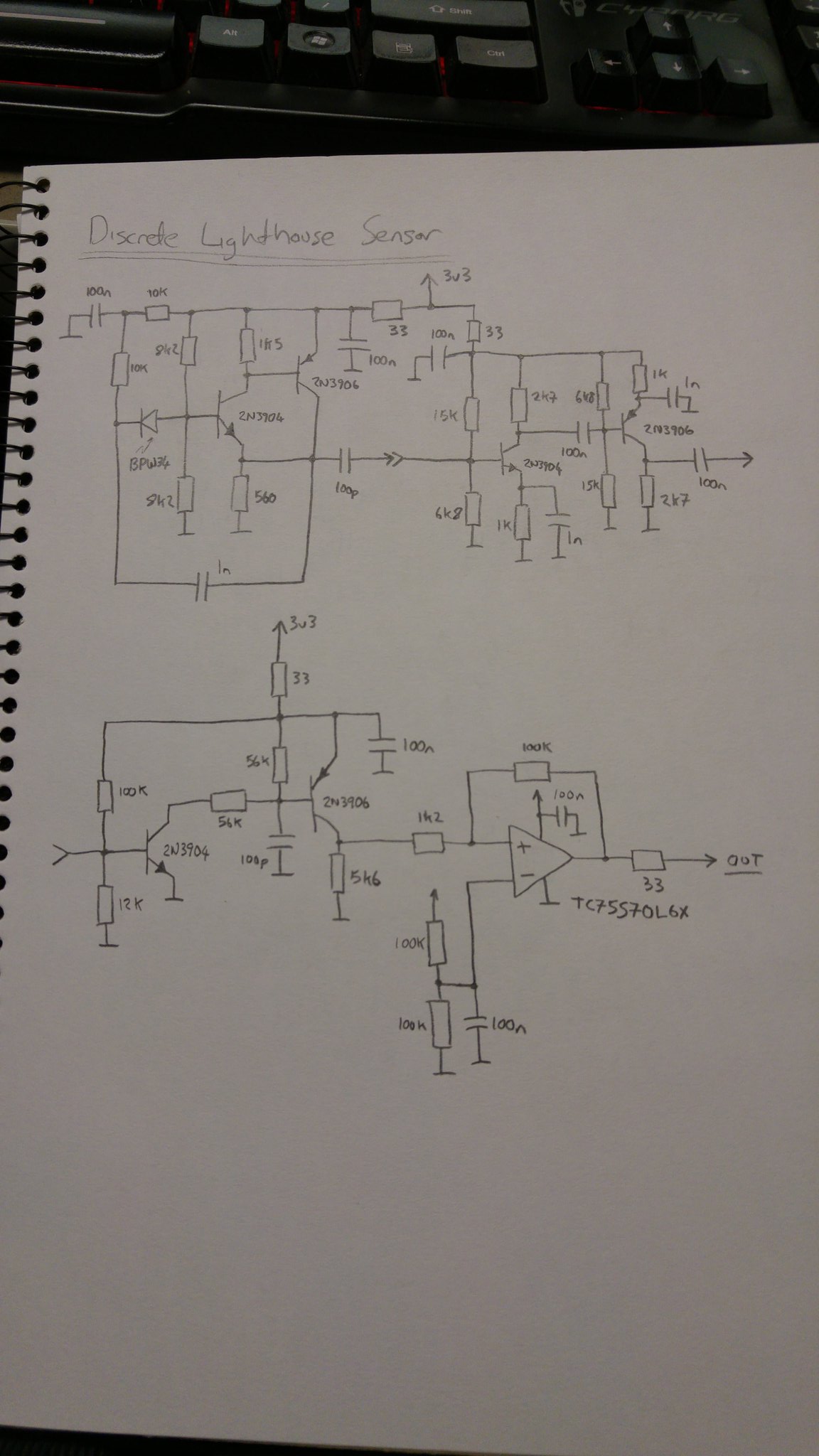 Second, the sensor is known – the real Vive wands use BPW43 photodiodes. The most likely reason for a photodiode instead of phototransistor is that is that the laser light from the lighthouses is modulated at around 2 MHz or so, both for helping to eliminate interference from other light sources and to potentially to allow more systems to work in the same space by transmitting data over the light signal. Phototransistors may not be fast enough for this.