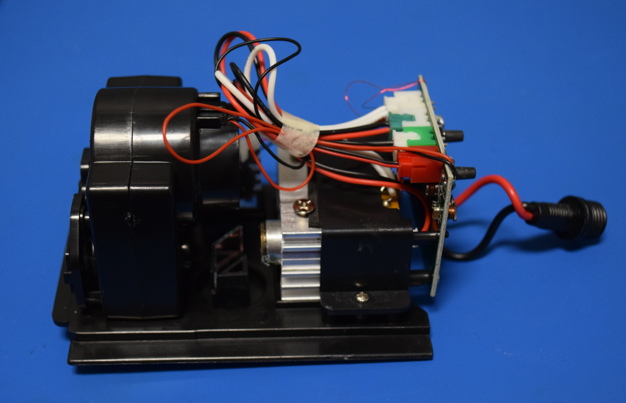 In the closeup image, you can see the thermal sensor (thin, red wires) and the heating pad are both clearly centered on the laser occupying the left position in the heatsink, which happens to be the green laser. Strangely enough, the blue laser sits in a black plastic sleeve that completely isolates it from the heatsink.
