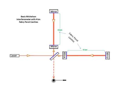The basic layout of the LIGO Interferometer. Note the Fabry Perot cavities that enable the 4 km long interfereometer to extend its functional length to 1200 km.