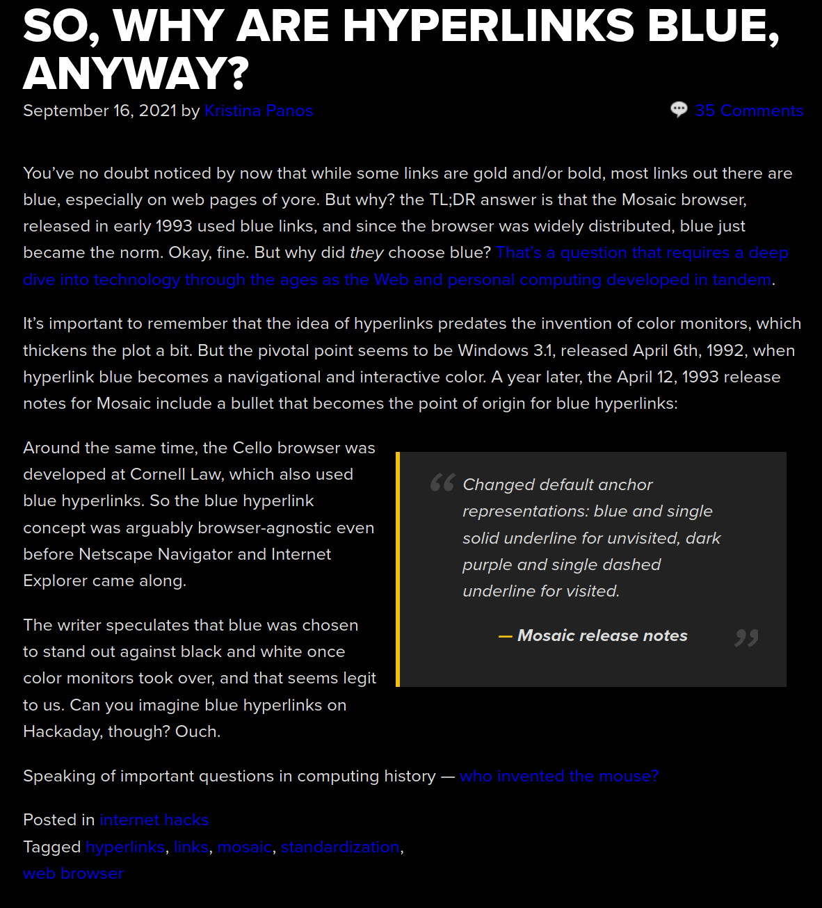 The writer speculates that blue was chosen to stand out against black and white once color monitors took over, and that seems legit to us. Can you imagine blue hyperlinks on Hackaday, though? Ouch.