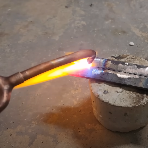 Inline check valves, on the other hand, were very much necessary, a mixture of oxygen and natural gas propagating back along the lines being undesirable for obvious reasons, and flashback arrestors would have been a good addition. [Hyperspace Pirate] built the torch itself out of copper tubing and needle valves, with a 0.9 mm MIG welder tip as the nozzle. Adjusting the gas mixture was mostly a matter of trial and error. With an oxygen-rich flame, it could cut thin metal decently well, but it tended to melt thick pieces more than it cut. On the other hand, even with a neutral flame, the water vapor in the exhaust oxidized steel, which made welding quite difficult, but not impossible.