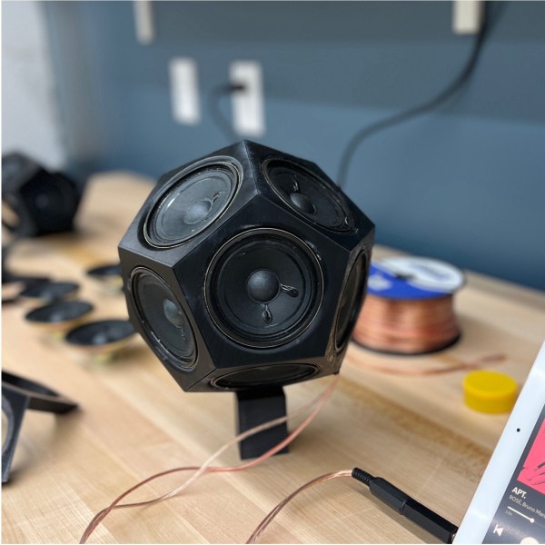 The speaker relies on a 3D-printed frame. The dodecahedron shell is assembled from 12 individual faces, each of which hosts a small individual speaker. Multichannel audio fans shouldn’t get too excited—all twelve speakers are wired to the same input in four groups of three, making this essentially an exceptionally complicated mono device. It might sound silly, but it’s actually a great way to deliver audio in many directions all at once. [Olivia] even went to the effort of running some sweep tests in anechoic and reverberation chambers to see how they performed, which is a fun bit of extra detail in the build log.