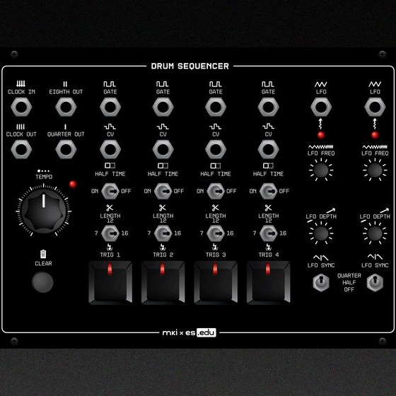This capable drum machine includes a bunch of features, including: 4 independent channels with one-button step input/removal; up to 16 steps per channel; optional half-time mode per channel; two synchronizable analog low-frequency oscillators (LFOs) for dynamic accents; resistor-DAC output for pitch or decay modulation; and an internal clock with 16th, 8th, and quarter note outputs, which can be synchronized with external gear.