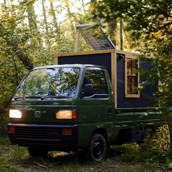 While we won’t argue one way or another on his claim to world’s smallest, as that likely depends on your definition of an RV, starting with a kei truck certainly puts you in a more compact format than something built on a bus chassis. With four wheel drive and a small footprint, this could be better for overlanding than the Rivian bed camper we featured recently.