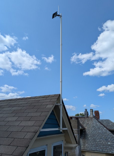 You see, at this point I had convinced myself that the reason I wasn’t getting any results back at home was the relatively meager antenna built into the Hacker Pager. Now that I had a proper node with an antenna bigger than my pinkie finger, I was sure I’d get better results. Especially since I’d be placing the radio even higher this time — with a military surplus fiberglass mast clamped into the old TV antenna mount on my three story house, the node would be around 40 feet (12 m) above the ground.