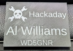 Since Supercon is coming up, I decided I wanted a “hello” badge that wouldn’t run out of batteries like my last one. It was easy enough to make a big plastic plate in OpenSCAD, import a Jolly Wrencher, and then put some text in, too.