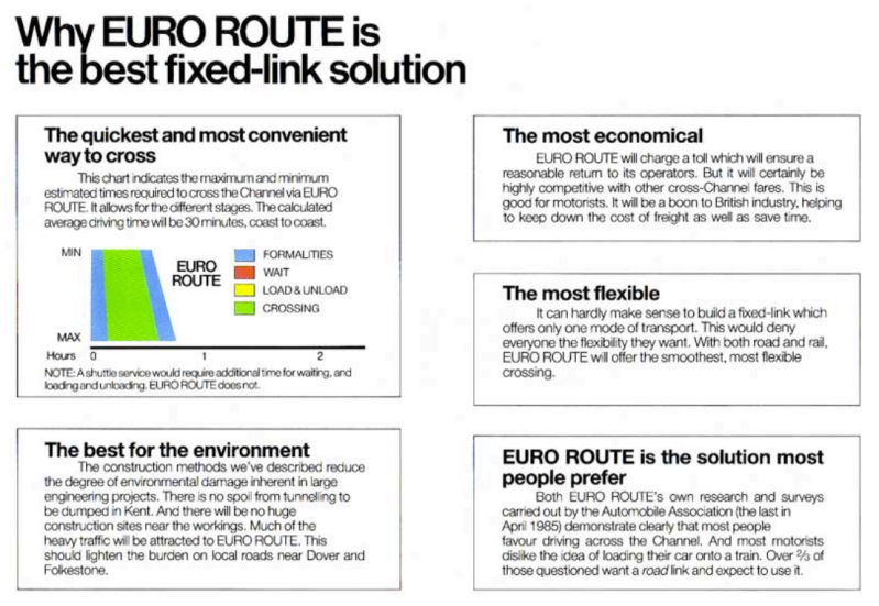 The Euro Route proposal noted that public sentiment was on its side. Contemporary research suggested that fifty-two percent of people preferred driving across, with many actively disliking the car shuttle concept. Yet when decision time came, the governments chose the Channel Tunnel—ultimately the simpler, cheaper rail-only proposal. The fact that the Channel Tunnel project would end up with massive budget overruns and significant delays perhaps casts that decision in a different light. At the same time, we might never know how well—or how badly—construction of the Euro Route might have gone.