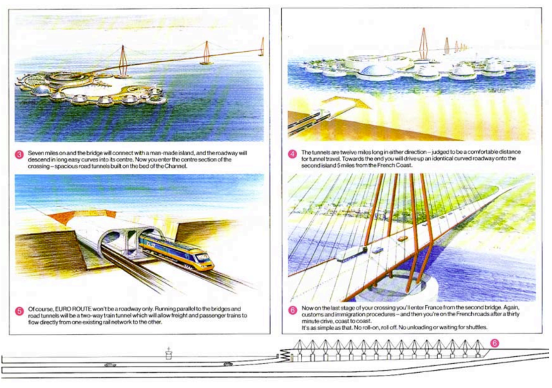 The Channel Tunnel might have been the winning project, but it wasn’t the only proposal on the table. The Euro Route project was an altogether bolder scheme. Their plan called for a three-stage crossing combining both road and rail. Cars would travel via a spectacular road link featuring bridges springing from each coast, leading into an immersed tunnel running through the deepest section of the Channel. Meanwhile, there would also be a twin-track rail tunnel not dissimilar from the Channel Tunnel itself.