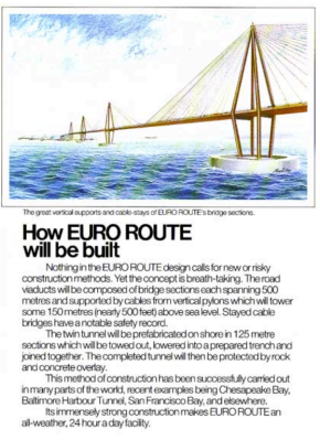 Forget the double handling involved in putting cars on trains and doing everything by rail. Instead, the aptly-named Euro Route proposed that motorists simply drive across the Channel, perhaps stopping for duty-free shopping in the middle of the sea along the way.