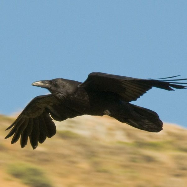 Top image: North American Common Raven (Corvus corax principalis) in flight at Muir Beach in Northern California (Credit: Copetersen, Wikimedia)