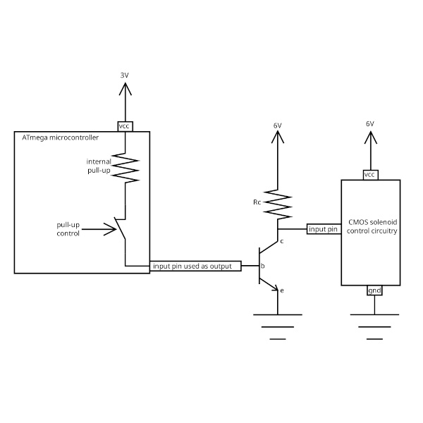 The whole thing takes advantage of the internal pull-up resistor that a microcontroller has among its internal kit of parts. Driving a transistor from an output pin usually requires a base resistor, so would it be possible to use the pullup as a base resistor? If the microcontroller can enable or disable the resistor on an input pin then yes it can, a transistor can be turned off and on with nary an output to be seen. In this case the chip is from ATmega parts bin so we’re not sure if the trick is possible on other manufacturers’ devices.