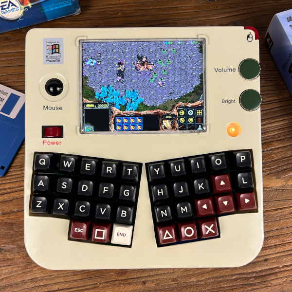 Aside from the motherboard there’s a VGA screen, a CompactFlash card attached to the IDE interface, and a Logitech trackball. As far as we can see the power comes from a USB-C PD board, and there’s a split mechanical keyboard on the top side. It runs Windows 98, and a selection of peak ’90s games are brought out to demonstrate.