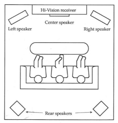This work led to the development of a standard known as Hi-Vision, which aimed to greatly improve the resolution and quality of broadcast television. At 1125 lines, it offered over double the vertical resolution of the prevailing 60 Hz NTSC standard in Japan. The precise number was chosen for meeting minimum requirements for image quality for a viewer with good vision, while being a convenient integer ratio to NTSC’s 525 lines (15:7), and PAL’s 625 lines (9:5). Hi-Vision also introduced a shift to the 16:9 aspect ratio from the more traditional 4:3 used in conventional analog television. The new standard also brought with it improved audio, with four independent channels—left, center, right, and rear—in what was termed “3-1 mode.” This was not unlike the layout used by Dolby Surround systems of the mid-1980s, though the NHK spec suggests using multiple speakers behind the viewers to deliver the single rear sound channel.