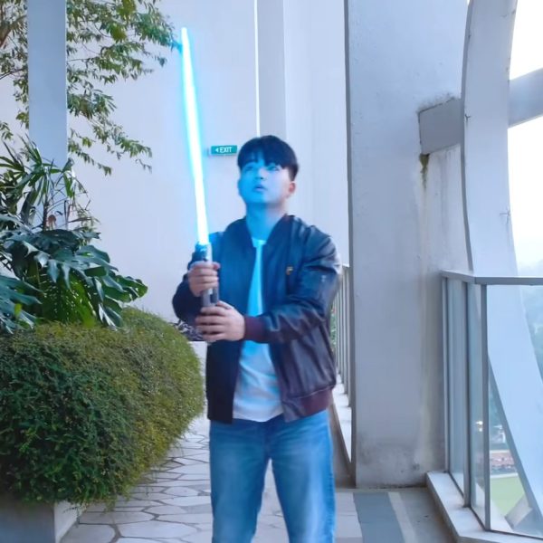The secret is… well, there’s more than one secret, here. The blade itself is made out of a “magician’s cane”, which is a coil of plastic that can spring outwards on demand for magic tricks. Hidden inside of it is a strip of LED lights. Of course one strip of LEDs would not be omnidirectional, and the magician’s cane is pretty floppy, but both of those problems are solved by the same idea: “I’ll try spinning. That’s a good trick.”