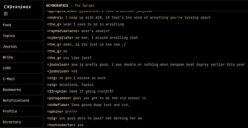It’s also niche enough that there’s nobody here but us chickens. That is, it looks like a site for geeks, nerds, tech enthusiasts — whatever you want to call us — it might just be via “security by obscurity”, but Cyberspace doesn’t seem likely to attract quite the same Eternal September the rest of the internet is drowning under.
