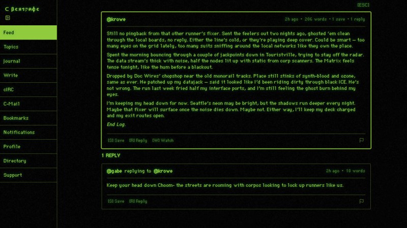 The pursuit of retro goes further through the themed web interface, as well. Sure, there’s light mode and dark mode, but that’s de rigueur. Threads might not offer a blue-and-white Commodore 64 theme, and you’d have little luck getting Bluesky to mimic the soothing amber glow of a VT-230, but Cyberspace offers that and more.