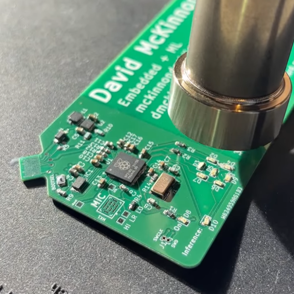 A PCB business card is a great way for electrical engineers to impress employers with their design skills, but the software they run can be just as impressive as the card itself. As a programmer with an interest in embedded machine learning, [Dave McKinnon] wanted a card that showcased his skills, so he designed one that runs voice recognition.