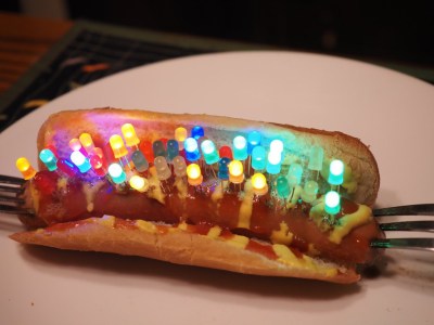 Everything is a fuse if you run enough current through it. [JohnsonFarms] pushed conductive filament to the melting point, and calibrated it along the way. While roasting a hotdog with mains voltage and a couple forks, [Ian Dunn] discovered that if you stick some LEDs in it, they light up.