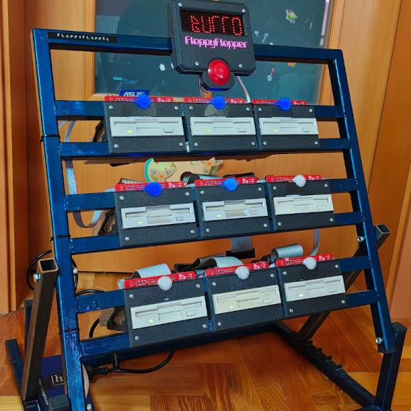[igor] could have easily faked this with NFC tags, as we’ve seen floppy-like interfaces do, or perhaps just use a color sensor. But no, those nine drives are all in working order. In the interest of speed — this is a timed challenge, after all, and we don’t need a PC slowing it down — each floppy is given its own microcontroller. Rather than reading data off the disk, only the disk’s write-protect and density holes are checked. He’s only using R, G, and B for floppy colors, so those four bits are enough. Unfortunately [igor]’s collection of floppies is very professional — lots of black and grey — so he needed to use colored stickers instead of technicolor plastic.