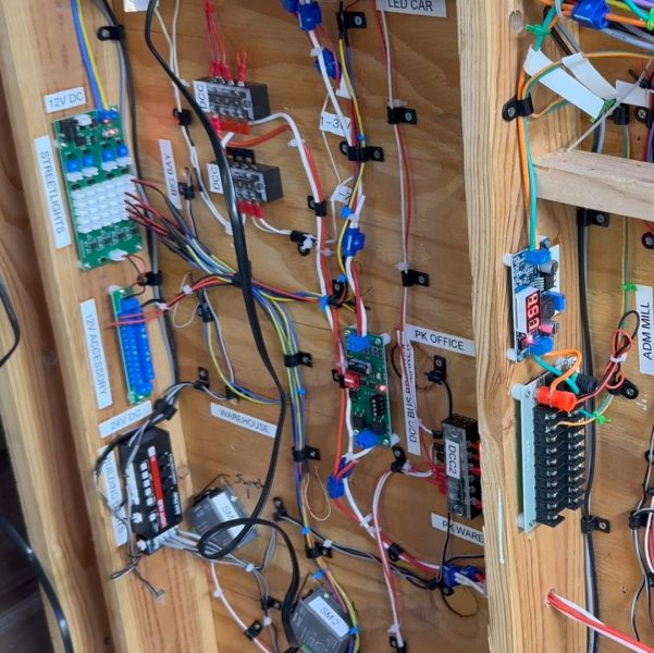 The second two videos are actually about wiring, in the sense of routing all the wires needed for a modern layout– which is a lot more than “plug the rheostat into the tracks in one spot” that our first Lionel boxed set needed. No, for the different accessories there are multiple busses at 5V, 12V and 24V along with DCC that need to be considered. Unsurprisingly enough given those voltages, he starts with an ATX power supply and breaks out from there.