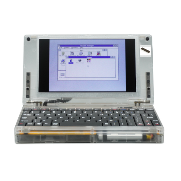 Both machines use the same see-through plastic case, screen, and keyboard, and there are plenty of pictures to examine the motherboard. There are even downloadable design files, which is an interesting development. They come with a removable though proprietary looking VGA card bearing a Tseng Labs ET4000, a CF card interface, a USB port which claims to support disk drives, a sound card, the usual array of ports, and an ISA expansion for which a dock is sold separately. The battery appears to be a LiPo pouch cell of some kind.