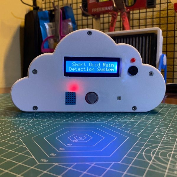 [Mohammed] decided to try and predict acid rain by building a simple device based on an Arduino Nano. It records SO2 levels with an MQ-136 gas sensor, and NO2 levels with an unspecified MEMS-based sensor. There’s also a DHT11 temperature & humidity sensor in the mix, which is important since moisture content plays a role. The Arduino reads these sensors and uses a simple predictive algorithm to create an “Acid Rain Risk Score” that is displayed on a 16×2 character LCD. It’s all wrapped up in a fun 3D printed enclosure that looks like a cloud.