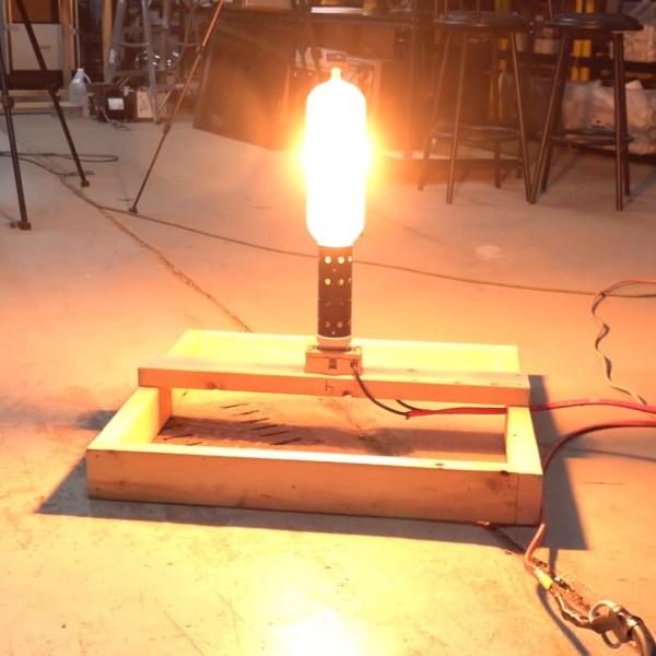 [Drake] says he has purchased the most powerful incandescent light bulb ever made for commercial production. Rated for 24,000 watts (and operated at 30,000 watts) the enormous filament is made from tungsten. The starting current drawn by a light bulb is higher than the operating current, because the resistance of the filament increases with temperature, so it’s prudent to warm the device slowly. To this end [Drake] builds some custom wiring and dials to power the thing. Once that’s done, it’s off to the forest to play!