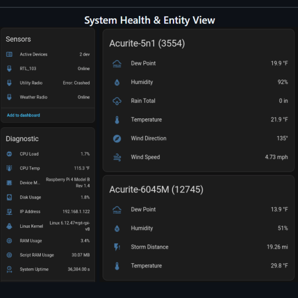 [Jaron’s] tool integrates these devices nicely into Home Assistant, where they’ll appear automatically thanks to MQTT discovery. It also offers nice signal metrics like RSSI and SNR, so you can determine whether a given link is stable. You can even use multiple RTL-SDR dongles if you’re so inclined. If you’re eager to pull some existing environmental sensors into your smart home, this may prove a very easy way to do it.