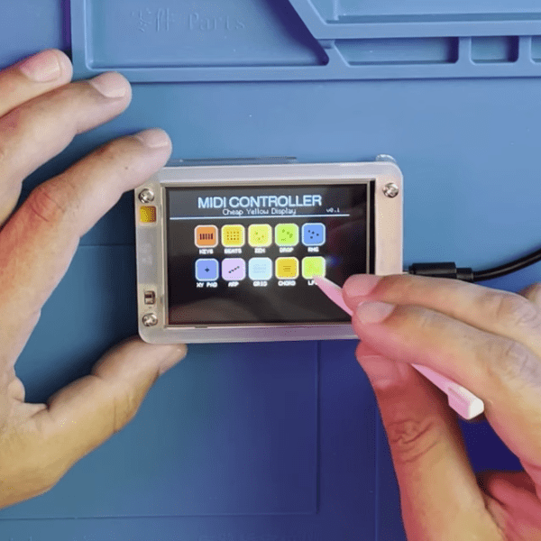 The build takes advantage of a device colloquially called the Cheap Yellow Display. It consists of a 320 x 240 TFT touchscreen combined with a built-in ESP32-WROOM-32, available under the part number ESP32-2432S028R.
