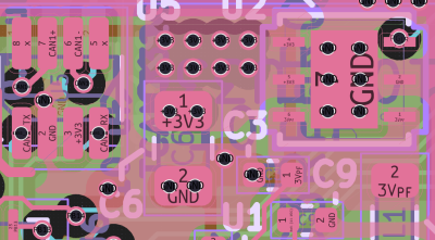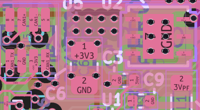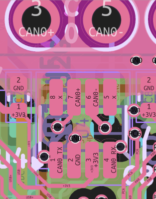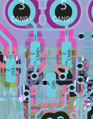 There is but one hiccup with the way they’re placed. ESD diode appnotes will tell you – there’s some extra considerations you can try and put into ESD diode layout. This design pulls connector tracks directly to the CAN ICs on top layer, and directly to diodes on the bottom one. Instead, you should try and route the signal “through” the ESD diodes – letting track inductance play in your favour, and not impeding the ESD diode’s impact.