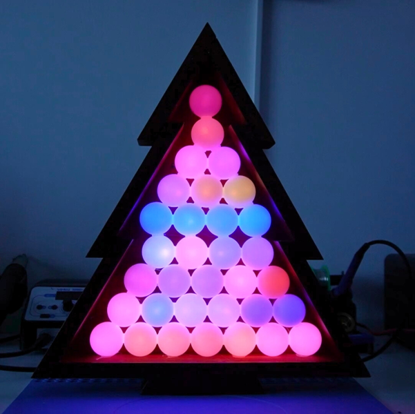 An ESP32-D1 mini runs the show here. It’s hooked up to a strip of WS2812B addressable LEDs. The LED strip is placed on a wooden frame resembling the shape of a traditional Christmas tree. Ping-pong balls are then stacked inside the wooden frame such that they act as a light diffuser for the LEDs behind. The microcontroller is also hooked up to an INMP441 omnidirectional MEMS microphone module. This allows the ESP32 to detect sound and flash the LEDs in time, creating a colorful display that reacts to music. This is achieved by using the WLED web installer to set the display up in a sound reactive mode.