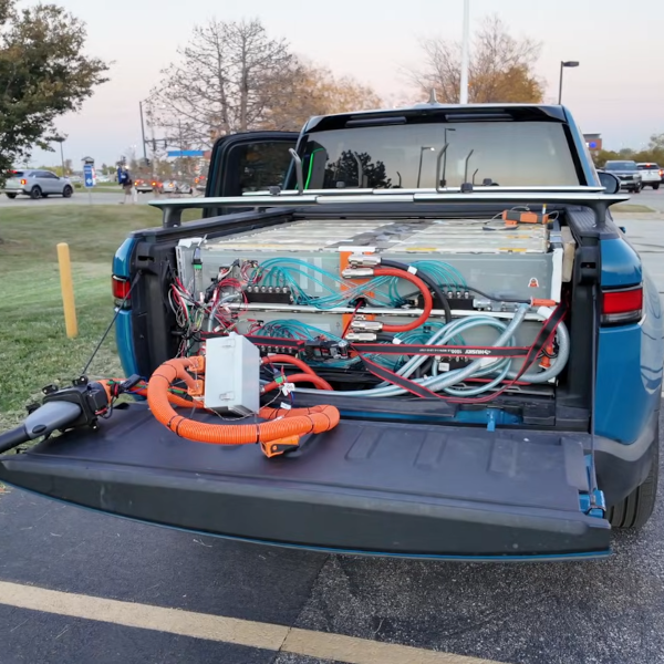 The vehicle used for this trial was a Rivian electric truck, chosen for a number of reasons. Primarily, [Ryan], the project’s mastermind, needed something that could hold a significant amount of extra batteries. The truck also runs software that makes it much more accepting of and capable of using an extra battery pack than other models. The extra batteries are also from Rivians that were scrapped after crash tests. The team disassembled two of these packs to cobble together a custom pack that fits in the bed of the truck (with the tonneau closed), which more than doubles the energy-carrying capacity of the truck.