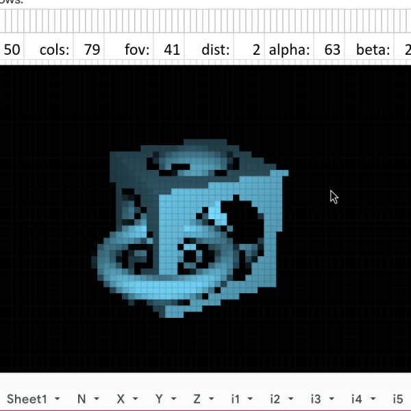 Under the hood, the ray marching works by casting a ray out from the camera and measuring its distance from a set of three-dimensional functions. If that distance is below a certain value, this is considered a surface hit. On surface hits, a simple normal shader computes pixel brightness. This is then rendered out by variable formatting in the cells of the spreadsheet.