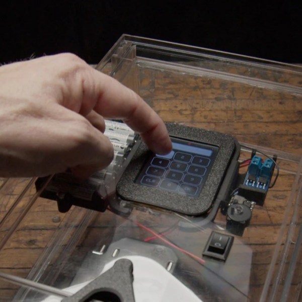 In this build eight AA batteries are used to deliver 12 volts to operate a solenoid controlling a latch and 5 volts for the microcontroller. The encasing is clear in order to entice players in an escape-room style sitting. The custom software is included down the bottom of the project page and it is also available from arduino.cc, if that’s your bag.