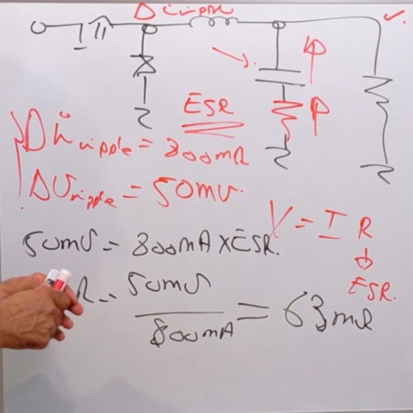 When our circuit calls for an electrolytic capacitor the equivalent series resistance (ESR) becomes relevant and we need to take it into account. The ESR is so predominant that in our calculations for the minimum capacitance to mitigate ripple we can ignore the capacitance and use the ESR only as it is the feature which dominates. [Dr Ali] goes into detail for both examples using ceramic capacitors and electrolytic capacitors. Armed with the minimum capacitance (in Farads) and maximum ESR (in Ohms) you can then go shopping to find a capacitor which meets the requirements.