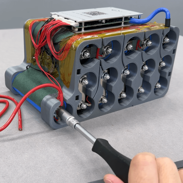 With the pack assembled using 3D printed parts, a battery management system is installed with the balance wires cleverly routed through the prints and attached to the bus bars. The only problem [Well Done Tips] had was not realizing that LiFePO4 batteries’ voltages settle a bit after being fully charged, which meant that he didn’t properly calculate the final voltage of his pack and had to add a cell, bringing his original 15S1P battery up to 16S1P and the correct 54V at full charge.