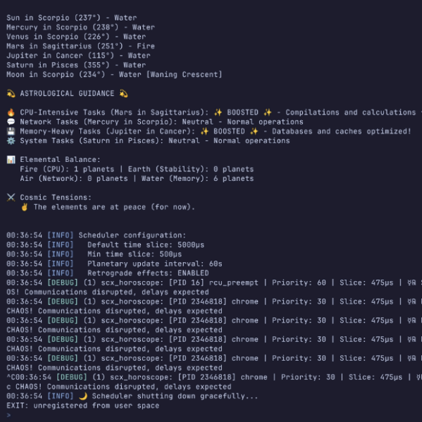 The project is called scx_horoscope, and it’s a sched_Ext scheduler that makes its CPU scheduling choices based on what the heavens are doing in real time. Different tasks are handled based on different astronomical objects. For example, the Sun represents life force, and thus grants boons to key system processes. The Moon, an emotive influence, rules over interactive processes like shells and terminals. Mercury, as the god of communication, handles network and IO tasks, and so it goes from there. It’s not just a surface level thing, either—[Lucas] has implemented the influences of the elements of fire, air, earth, and water, and there are negative timeslice penalties on associated tasks when a given planet lands in retrograde.