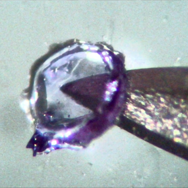 A small plastic object can be seen in front of the tip of a hypodermic needle. The object is made of clear, slightly purple-tinted plastic. It is roughly circular, with edges thicker than the center.