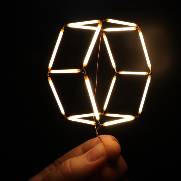 The problem isn’t as straightforward as it might first appear: all the segments need to be illuminated, there should be as few powered junctions as possible, and to allow a single power supply voltage, all paths between powered junctions should have the same length. Ideally, all filaments would carry the same amount of current, but even if they don’t, the difference in brightness isn’t always noticeable. [Tim] found three ways to power these structures: direct current between fixed points, current supplied between alternating points so as to take different paths through the structure, and alternating current supplied between two fixed points (essentially, a glowing full-bridge rectifier).