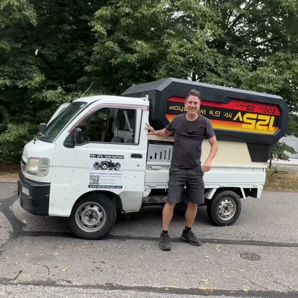 [Ron “Mr. G” Grosinger] is a high school auto shop and welding teacher who worked with his students to replace the 40 hp gas motor in this Daihatsu Hijet with the 127 hp of a Hyper 9 electric motor. The motor sits in the original engine bay under the cab and is mated to the stock transmission with a custom adapter plate made from plate steel for less than $150. We really appreciate how they left all the electronics exposed to see what makes the conversion tick.