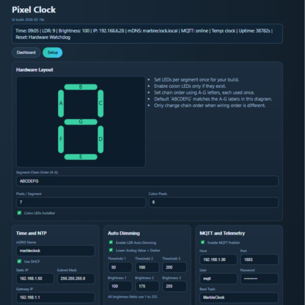 Pixel Clock is code for the Wemos D1 Mini microcontroller board and WS2812/WS2812B RGB LED strips, but it’s made to be flexible enough to support different implementations. For example, altering which LEDs in the strip belong to which segments on which digits can be configured entirely from the web interface. Naturally, one could build an LED strip clock using the same layout [Rybitski] did and require no changes at all — but it’s very nice to see that different wiring layouts are supported without needing to edit any code. There’s even automatic brightness adjustment if one adds an LDR (light-dependent resistor), which is a nice touch.