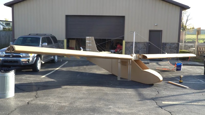 History is full of engineers making (or attempting to make) things out of the wrong stuff, from massive wooden aircraft to boats made of ice and sawdust. [PeterSripol] is attempting to make an ultralight aircraft out of a rather wrong material: cardboard. In the previous installment of the project, a pair of wings was fabricated. In this installment, the wings find their home on an equally mostly cardboard fuselage, complete with rudder and elevator.