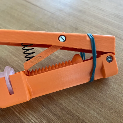 How does it work? The ratcheting lever mechanism is similar to that of a hot glue gun, where an arm slips into notches in a rod when pressed down, driving it forward and never backward. In the process, a larger lever movement is translated into a shorter plunger travel, enhancing control.
