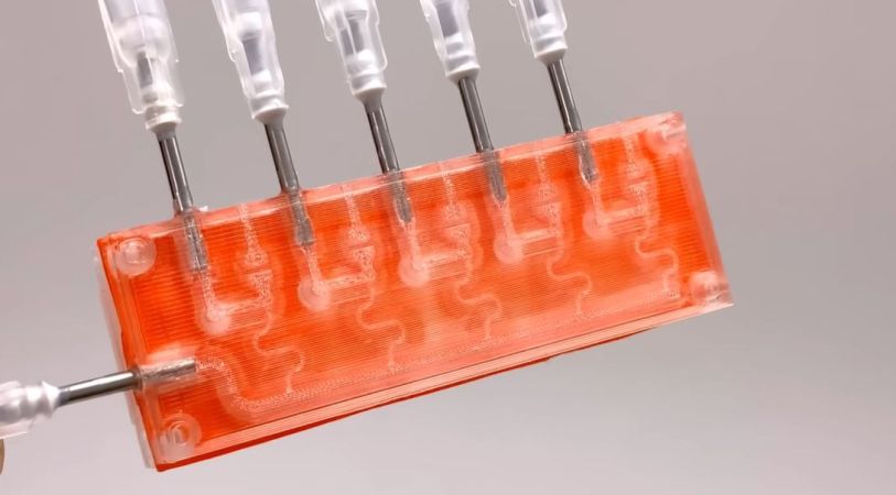 Logically, a voltage potential or a pressure differential isn’t so different, and can be used in a similar way. A transistor for example is akin to the vacuum tube, which in British English is called a valve for good reason. Through creative use of a flexible silicone membrane and rigid channels, pulling a vacuum in the ‘gate’ channel allows flow through the other two channels.