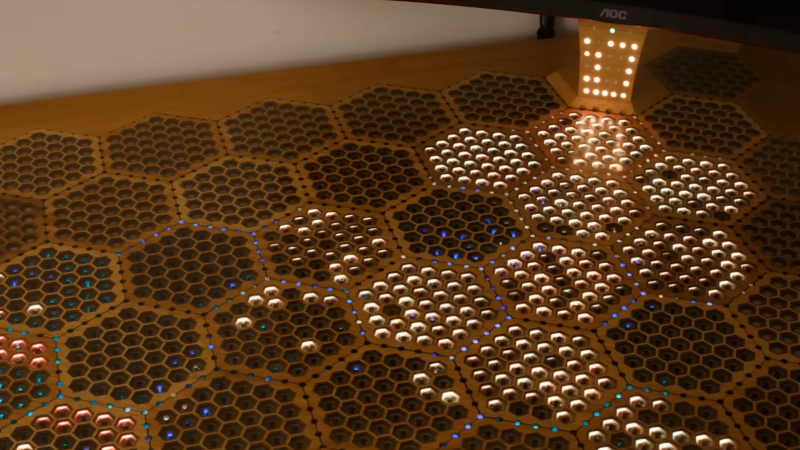 What’s cool about the display is that it’s not just running some random RGB animations. Instead, the desk has a Raspberry Pi 5 dedicated to running a beehive simulation, where algorithmic rules determine the status (and thus color) of each hexagonal cell based on the behavior of virtual bees loading the cells with honey. It creates an organic, changing display in a way that’s rather reminiscent of Conway’s Game of Life.