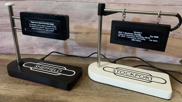 [eastfamilyreddish] took the concept further by adapting this hardware into a more pleasing form. The ESP32 and OLED screen are built into a neat little hanging sign setup that apes one you might expect to see at a real railway station. You might expect that 3D printing was involved, but instead, this was achieved with lasercut parts and resin casting to create something with a beautiful finish. They even went so far as to include a wireless phone charging module in the base, making the device extra useful to really earn its place on the desktop.